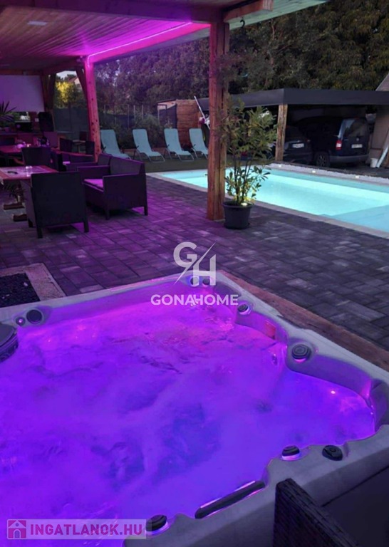 - 75 m²-es TERASZ több ponton fedett, beépített, 6 személyes WELLIS JAKUZZIVAL, zuhanyzóval, valamint fűthető, fokozatosan mélyülő MEDENCÉVEL (legmélyebb pontja 2 méter, a medence elején NAPOZÓ- és sekély PANCSOLÓRÉSZ került kialakításra