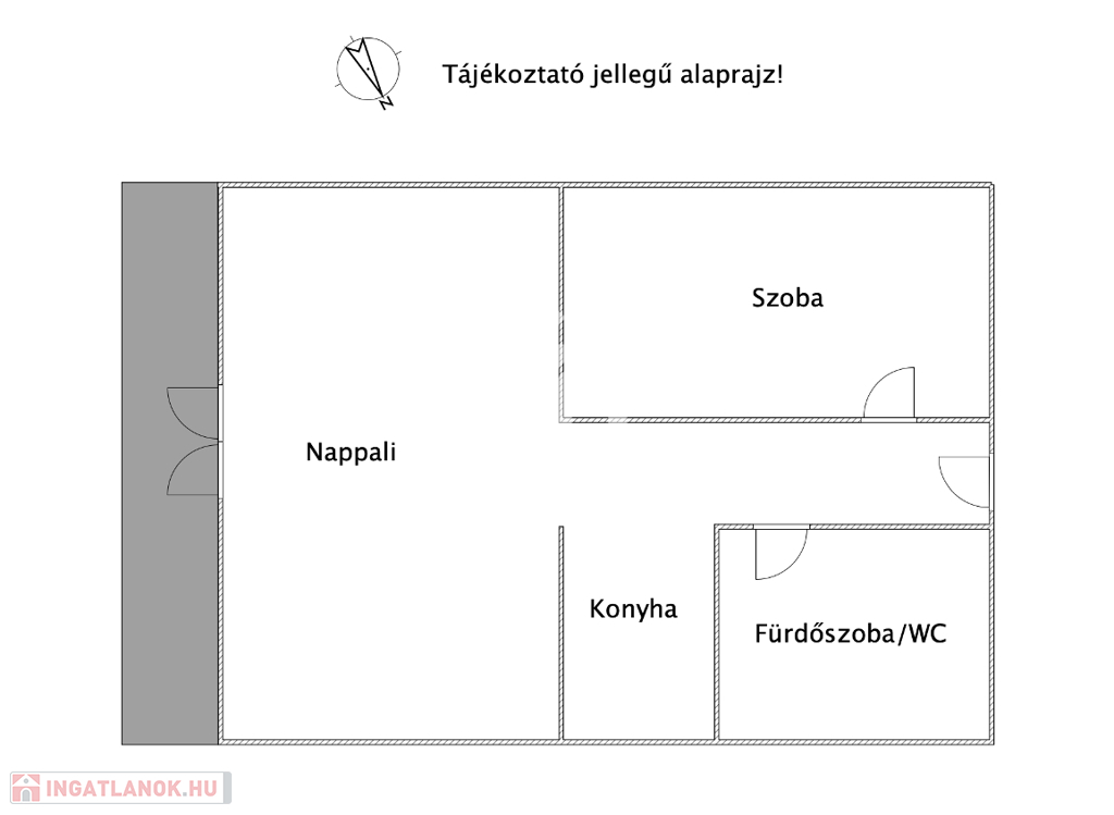 - 1 egész szobából, 1 félszobából, 1 előszobából, 1 konyhából, 1 fürdőszobából/ Wc-ből áll.