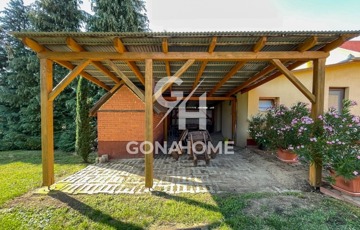 A kertben fedett kiülő, padok és bográcsozási lehetőség is kialakításra került.